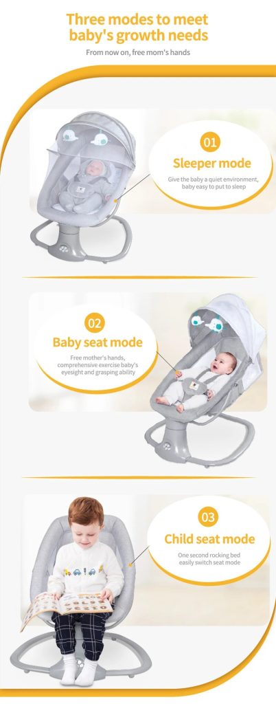 When you need to use the restroom, prepare meals, or handle an emergency, your baby is crying because you can’t spare a hand to comfort them. We understand the overwhelm and helplessness new mothers feel when their babies are upset. Don’t worry, we’ve got the perfect solution. The swing features five soothing speeds that mimic your gentle embrace, making your baby feel secure and calm. With adjustable motion settings, this infant swing caters to your baby’s preferences for quick soothing. Whether you’re on the couch or in bed, you can easily control the motion, music, and timing of the swing with the remote, giving you the freedom to relax. The Baby Swing is your ultimate helper!